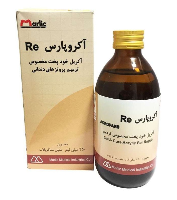موارد مصرف: 1- ترمیم شکستگی پروتزهای دندانی 2- افزایش پروتز دندانی 3- ریلاین پروتزهای دندانی ویژگی ها: - زمان کافی جهت ترمیم و یا ریلاین - چسبندگی بسیار خوب به پروتزهای کهنه - پالیش پذیری خوب - ثبات عالی رنگ راهنمای استفاده: آكروپارس RE به دو روش خميری و قلم مو قابل استفاده می باشد: - روش خميری: 2.5 گرم مايع و 5 گرم پودر را مخلوط كرده و حدود 30 ثانيه با اسپاتول تميز به هم بزنيد. در شرايط حرارت معمولی (23c°) حدود 2 دقيقه فرصت كار كردن با مخلوط را داشته و پس از 14 دقيقه اين مخلوط كاملاً سخت خواهد شد. قبل از قرار دادن مخلوط آكريل بايد سطح كست با مايع جدا كننده آكروپارس BF مناسب آغشته شده و كاملا خشک شود. سپس خمير بدست آمده در محل موردنظر قرار دهيد. جهت جلوگيری از تبخير منومر و حباب زدن می توانيد كست را درون ديگ فشار قرار داده و پس از 10 دقيقه آن را خارج كرده، اضافات آنرا بريده و پرداخت نمائيد. - روش قلم مو: در اين روش بايد مايع داخل يک گوده و پودر آن داخل نمک پاش ريخته شود. ابتدا سطح كست را با محلول جدا كننده آكروپارس BF آغشته و خشک كنيد. سپس با قلم مو سطح كست يا محل ترميم پروتز را با منومر آغشته كرده و روی آن پودر بپاشيد تا كاملاً جذب مايع گردد. مجدداً اين عمل را تكرار كنيد تا كمی بيشتر از ضخامت دلخواه بدست آيد. پس از 10 دقيقه عمل پليمريزاسيون كامل شده می توانيد اضافات آنرا بريده و سطح آنرا پرداخت نمائيد. بسته بندی: - یک عدد مایع 250 میلی لیتریمایع آکریل فوری